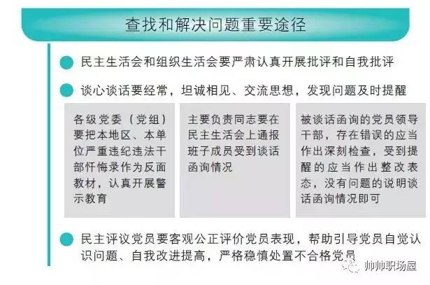 各級(jí)黨組織和廣大黨員要堅(jiān)持學(xué)做結(jié)合,突出針對(duì)性,敢于直面問(wèn)題,勇于自我革命,把查找解決問(wèn)題作為“兩學(xué)一做”學(xué)習(xí)教育的規(guī)定要求。 黨員要對(duì)照黨章黨規(guī),對(duì)照系列講話(huà),對(duì)照先進(jìn)典型,把自己擺進(jìn)去,經(jīng)常自省修身,打掃思想灰塵、進(jìn)行“黨性體檢”,有什么問(wèn)題解決什么問(wèn)題,什么問(wèn)題突出重點(diǎn)解決什么問(wèn)題;要查找分析理想信念是否堅(jiān)定、對(duì)黨是否忠誠(chéng)老實(shí)、大是大非面前是否旗幟鮮明、是否做到在思想上政治上行動(dòng)上同以習(xí)近平同志為核心的黨中央保持高度一致,著力解決黨的意識(shí)不強(qiáng)、組織觀(guān)念不強(qiáng)、發(fā)揮作用不夠等問(wèn)題。 各級(jí)黨委(黨組)要查找分析是否落實(shí)全面從嚴(yán)治黨主體責(zé)任,是否堅(jiān)決執(zhí)行黨的理論和路線(xiàn)方針政策,是否認(rèn)真堅(jiān)持民主集中制,著力解決黨的領(lǐng)導(dǎo)弱化、黨的建設(shè)缺失、管黨治黨寬松軟等問(wèn)題。 黨支部要查找分析組織生活是否經(jīng)常、認(rèn)真、嚴(yán)肅,黨員教育管理監(jiān)督是否嚴(yán)格、規(guī)范,團(tuán)結(jié)教育服務(wù)群眾是否有力、到位,著力解決政治功能不強(qiáng)、組織軟弱渙散、從嚴(yán)治黨缺位等問(wèn)題。 要把黨的組織生活作為查找和解決問(wèn)題的重要途徑,注意聽(tīng)取群眾的意見(jiàn)和反映,抓早抓小、防微杜漸。民主生活會(huì)和組織生活會(huì)要嚴(yán)肅認(rèn)真開(kāi)展批評(píng)和自我批評(píng),堅(jiān)持“團(tuán)結(jié)-批評(píng)-團(tuán)結(jié)”,嚴(yán)于自我解剖,熱忱幫助同志。談心談話(huà)要經(jīng)常,坦誠(chéng)相見(jiàn)、交流思想,發(fā)現(xiàn)問(wèn)題及時(shí)提醒。各級(jí)黨委(黨組)要把本地區(qū)本部門(mén)本單位嚴(yán)重違紀(jì)違法干部懺悔錄作為反面教材,認(rèn)真開(kāi)展警示教育。主要負(fù)責(zé)同志要在民主生活會(huì)上通報(bào)班子成員受到談話(huà)函詢(xún)情況;被談話(huà)函詢(xún)的黨員領(lǐng)導(dǎo)干部,存在錯(cuò)誤的應(yīng)當(dāng)作出深刻檢查,受到提醒的應(yīng)當(dāng)作出整改表態(tài),沒(méi)有問(wèn)題的說(shuō)明談話(huà)函詢(xún)情況即可。民主評(píng)議黨員要客觀(guān)公正評(píng)價(jià)黨員表現(xiàn),幫助引導(dǎo)黨員自覺(jué)認(rèn)識(shí)問(wèn)題、自我改進(jìn)提高,嚴(yán)格穩(wěn)慎處置不合格黨員。