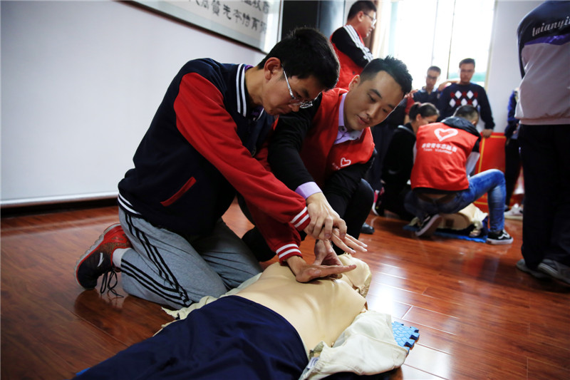 10月22日,泰安一中ALIVE意外求生與急救社70余名同學(xué)接受了來自泰安市中心醫(yī)院應(yīng)急辦攜手“男丁格爾”志愿團(tuán)的男護(hù)們帶來的心肺復(fù)蘇急救知識的培訓(xùn)。 中心醫(yī)院急救護(hù)士孟勐利用多媒體和現(xiàn)場示范的形式對師生們進(jìn)行了心肺復(fù)蘇急救培訓(xùn),介紹了心肺復(fù)蘇的操作要領(lǐng),包括判斷呼吸和意識、呼救、胸外按壓、開放氣道、人工呼吸等方面的知識,并就操作過程中的注意事項(xiàng)逐一進(jìn)行示范。講解結(jié)束后,10余名志愿者指導(dǎo)全體師生進(jìn)行了分組練習(xí),師生們爭先恐后的動手操作,期間他們還向社團(tuán)贈送了30冊《衛(wèi)生應(yīng)急知識》宣傳手冊。 此次培訓(xùn)增強(qiáng)了師生的急救意識,豐富了急救知識,使同學(xué)們認(rèn)識到發(fā)生意外傷害和突發(fā)事件時,要迅速進(jìn)行自救、互救,爭取最大程度地減少傷殘、甚至死亡。活動凸顯了急救常識從學(xué)生抓起的重要意義,活動結(jié)束后,參加培訓(xùn)的同學(xué)互相分享心得體會,同時意識到掌握急救技能、提高自救互救能力的重要性。