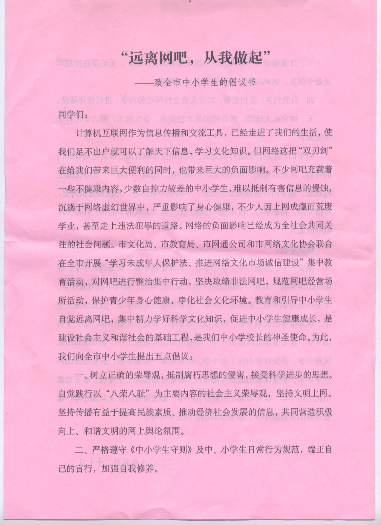 "遠(yuǎn)離網(wǎng)吧,從我做起"-----致全市中小學(xué)生倡議書