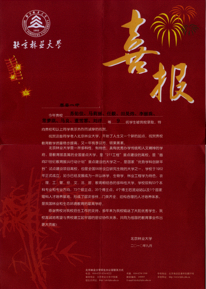 北京林業(yè)大學(xué)致我校喜報(bào)