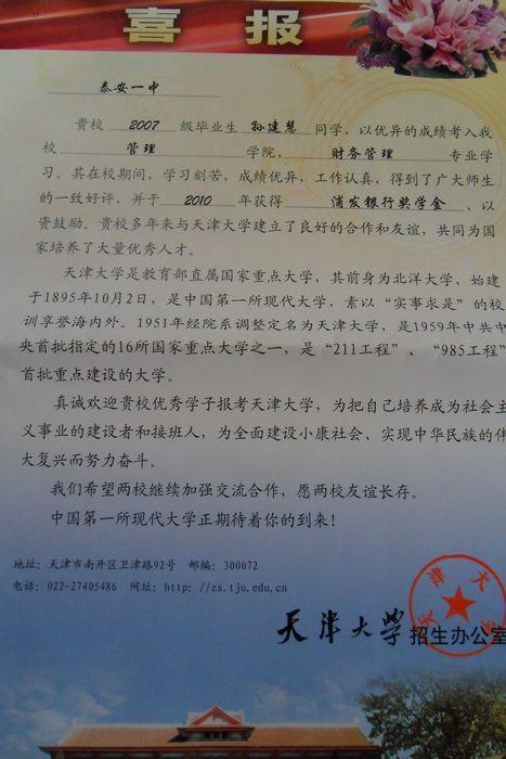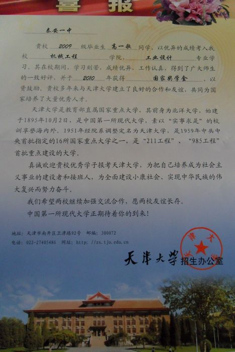 天津大學(xué)致我校喜報(bào)