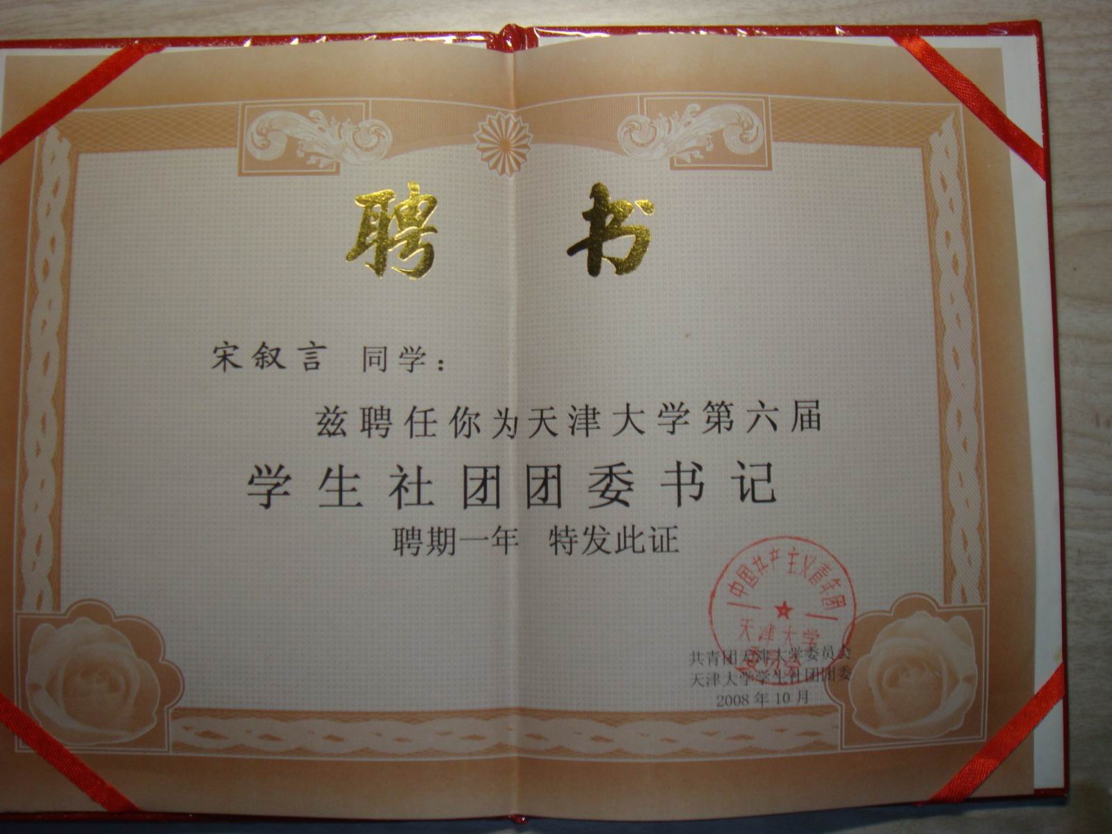 我校2006屆畢業(yè)生宋敘言同學進入天津大學后展示出了優(yōu)良的綜合素質(zhì),表現(xiàn)出了較強的管理才能、實踐能力和創(chuàng)新意識。2008年,他被學校聘為第六屆學生社團團委書記,個人先后榮獲2008年天津市大中專生暑期社會實踐活動先進個人(全校僅10人獲此獎,評選范圍為天津市)、2008年天津大學學生志愿者暑期社會實踐活動優(yōu)秀社會實踐報告一等獎、天津大學第九期“學生科技英才”稱號(全校僅70人,從全部本科生、碩士生、博士生共3萬人中評出)。