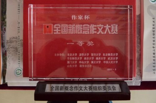 在2011年1月29日結(jié)束的“作家杯”第十三屆全國(guó)新概念作文大賽復(fù)賽中,我校梁紅老師指導(dǎo)的高一四班周艷秋同學(xué)喜獲B組(高一組)比賽一等獎(jiǎng),為我校贏得了榮譽(yù)。