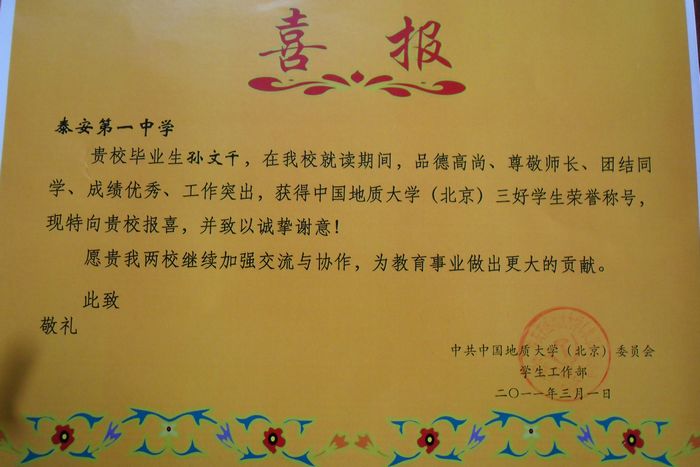 中國(guó)地質(zhì)大學(xué)致我校喜報(bào)