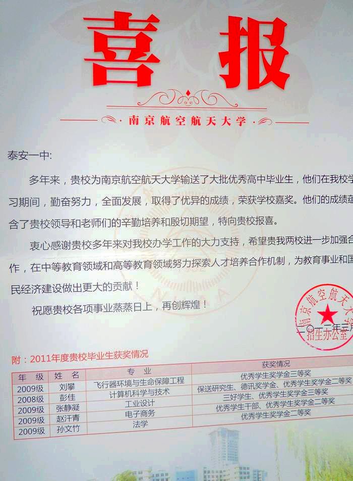 南京航空航天大學(xué)致我校喜報(bào)