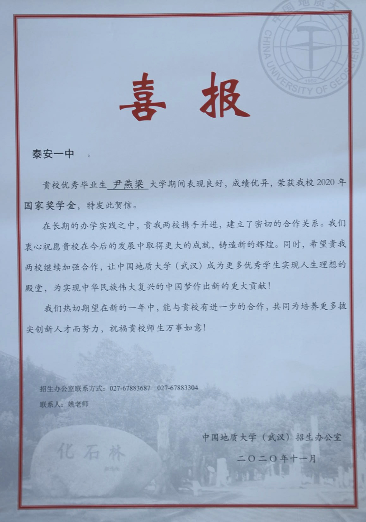 蘭蕙芬芳,桃李爭妍,不負韶華再追夢。2020年,泰安一中先后收到了清華大學、北京大學、復旦大學、中國科學院大學等50多所重點大學發(fā)來的喜報。泰安一中是北大、清華、復旦等全國近六十所重點大學命名的優(yōu)質生源基地,領跑在為重點大學輸送優(yōu)秀生源學校的前列,每年學校都會收到大批高校發(fā)來的喜報、賀信。泰安一中歷年培養(yǎng)的優(yōu)秀畢業(yè)生不僅高考成績優(yōu)異、考上的名牌大學數(shù)量多,而且到了大學以后,綜合素質全面、發(fā)展后勁足、可持續(xù)發(fā)展能力強。他們中有的獲得國家獎學金,有的獲得三好學生、本科特優(yōu)生、優(yōu)秀學生干部等榮譽稱號,在不同的崗位上也屢創(chuàng)佳績,為泰安一中爭得了榮譽。 泰安一中堅持以學生為中心的辦學思想,積極開發(fā)先進的課程體系。“一個中心、五個平臺”的發(fā)展性課程體系為學生發(fā)展提供良好的平臺。學校根據(jù)學生的興趣愛好開設學科競賽輔導,為學生的特長發(fā)展提供支持。學生在數(shù)學、物理、化學、生物、信息五大學科競賽、作文大賽、英語競賽中充分展現(xiàn)出個人的才質和特長,取得了優(yōu)異成績;學校不僅重視學習成績,更著眼于學生的全面發(fā)展,重視學生綜合素質的培養(yǎng)。學校每年的社團活動與課本劇展演、師生書畫展、歌詠比賽、運動會等文體活動,發(fā)掘了學生的創(chuàng)新潛力,培養(yǎng)了學生的創(chuàng)新能力,提高了學生的綜合素養(yǎng),讓學生的身心得到全面發(fā)展。 未來泰安一中將繼續(xù)圍繞出名師、育名生、創(chuàng)名校的辦學目標,進一步完善、優(yōu)化創(chuàng)新人才、拔尖人才的培養(yǎng)體系,打造適合學生全面發(fā)展、個性化發(fā)展的平臺,讓更多一中學生走入名牌大學,走向更廣闊的發(fā)展舞臺,為國家和民族振興貢獻力量。