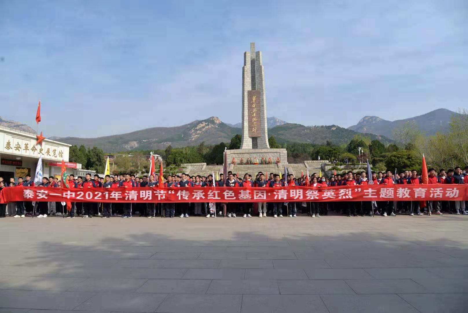 為迎接中國共產(chǎn)黨成立100周年,引導(dǎo)未成年人慎終追遠,緬懷先烈,繼承革命先烈遺志,促進學(xué)校精神文明建設(shè),2021年清明節(jié)之際,泰安一中組織學(xué)生到泰安革命烈士陵園開展了“傳承紅色基因?清明祭英烈”主題教育活動,清明節(jié)祭奠革命先烈活動已成為泰安一中多年來對學(xué)生進行思想道德教育的傳統(tǒng)活動。 4月5日上午,泰安一中師生800余人步行來到泰安革命烈士陵園,活動在同學(xué)們齊唱的國歌聲中拉開帷幕,2020級兩名學(xué)生代表王子琛、閆梓瑞和教師代表安存誠向革命烈士獻詞,國旗護衛(wèi)隊四名同學(xué)身著禮服向烈士紀念碑敬獻了花籃。 祭掃儀式后,同學(xué)們帶著哀思,懷著敬仰,來到烈士墓前,向烈士三鞠躬并敬獻鮮花。 通過此次活動,同學(xué)們用青春的承諾,展示了當代學(xué)子不懈奮斗、立志成才、回報社會、報效祖國的豪情與壯志!表示要樹立遠大理想,堅定愛黨、愛國、愛社會主義的信念,珍惜美好時光,勤奮學(xué)習(xí)文化科學(xué)知識,掌握報國本領(lǐng),加強自身的思想道德修養(yǎng),培養(yǎng)優(yōu)秀品德,努力成為社會主義事業(yè)合格的建設(shè)者和接班人,為實現(xiàn)中華民族的偉大復(fù)興貢獻自己的智慧和力量。